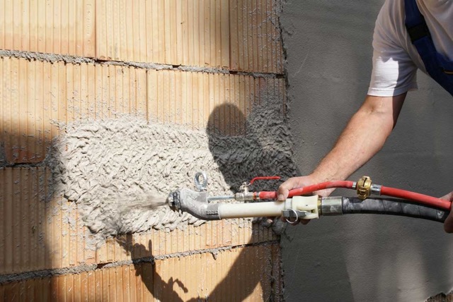 - Машинная штукатурка внутри помещений гипсовым или цементным раствором.